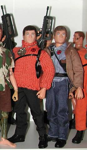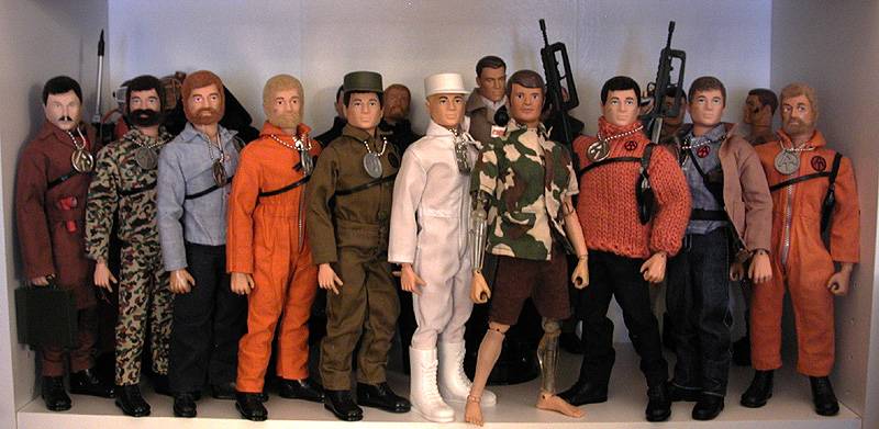 This is my new Adventure Team. I put these together from various sources. Mostly the dog tags are from new modern AT sets. Boots are repro from various sets. Some of the holsters came from Spy Island sets, some from the GI Joe club "Fix Me Up" kits. From the left: