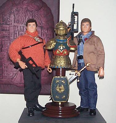 Here, the Tech Adventurer poses with the new Sea Adventurer, next to a bust of medieval armor. The Tech Adventurer deals in high-tech knowledge. The new Sea Adventurer enhances his traditional outfit of jeans and jean-shirt with a rugged outer jacket. While both are seen posing with guns left over from the Joe/Cobra war of the 1980s, they are also equipped with shoulder holsters. The Tech Adventurer has gone for the vintage style revolver, the new Sea Adventurer prefers the Walther P38.