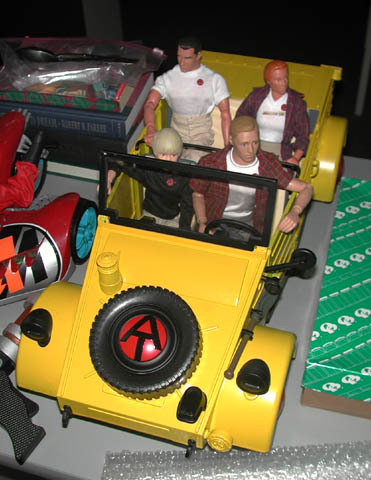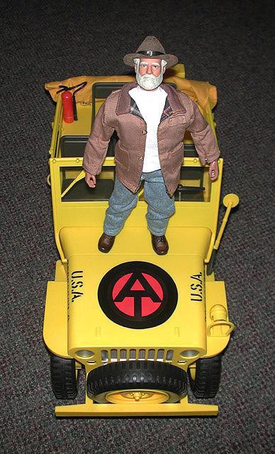 This is Formative International (Soldiers of the World) new "Follow Me" Jeep. It's bright Adventure Team yellow, and quite nice! It comes with a roll-bar-like frame with canvas cover also in yellow. In this picture it is retracted. I added the fire extinguisher, and I'll probably add more to it later.