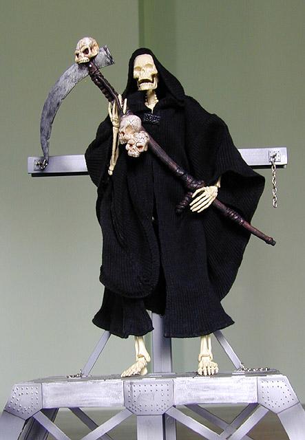 On October 30, 2002, my office had a part and I brought in all of my monsters and aliens for display for the kids who would show up. So while I was setting this skeleton up, I was rummaging through a parts box and found both the Star Wars Emperor's robe as well as the scythe from a WWF 12" figure. The kitbash came together rather quickly, and with no planning at all. Pure serendipity.