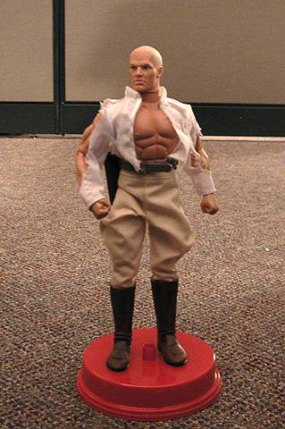 This is a custom I've had in the works for some time now. The only thing left to do is flock the hair in a Doc-Savage-like widow's peak. The jodhpur pants, boots and holster are from the Hasbro Japanese Foreign Soldier. The shirt is a Ken shirt torn up. The belt is a Han Solo belt I think. When you think of it, Hasbro could pound out a Doc Savage figure with very little effort. They have all the pieces... they just need the license.