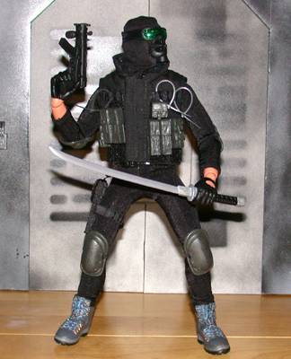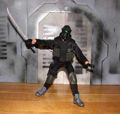 I used a CC Recruit-head GI Joe (no hairline, sort of stunned look - perfect!) and used a pair of "Foreign Soldier" hands. I used the Tactical Advisor sweater, and a pair of black pants with similar fabric. The shoes are currently Captain Action Green Hornet/Kato shoes, but I may change those to less shiny shoes. I painted the head with craft paint, which will peel off easily if harrassed. But these figures are for display, not play, so this paint will do.
