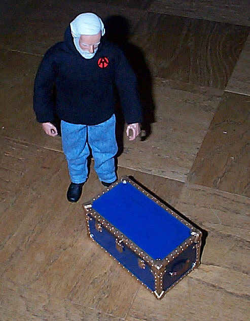 This trunk, which is molded in military green plastic, has great detail. I simply painted the trim Testors Gold, which is perfect, and if it goes on a little sloppy, it just makes it look used. Then the blue is Testors Blue. That color tends to be uneven if not stirred very ver well, so some parts of this trunk are darker than others, but chalk that one up to experience.